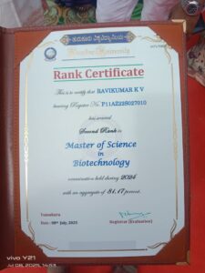 ಎಂ. ಎಸ್. ಸಿ ಬಯೋ ಕೆಮಿಸ್ಟ್ರಿ ವಿಭಾಗದಲ್ಲಿ 5ನೇ ರಾಂಕ್ ಪಡಿದಿದ್ದು ಕರ್ನಾಟಕದ ಘನತೆವೆತ್ತ ರಾಜ್ಯಪಾಲರಾದ ಶ್ರೀ. ಥಾವರ್ ಚೆಂದ್ ರವರಿಂದ ಪುರಸ್ಕೃತ ಗೊಂಡರು.